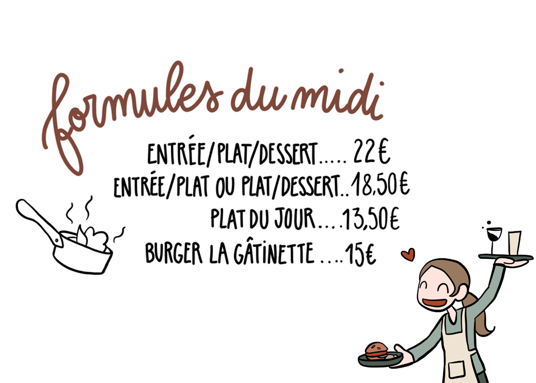 Chaque midi, dans une ambiance animée et décontractée, la Cheffe vous propose une cuisine française moderne et inventive, faite maison, privilégiant les produits locaux et de saison.